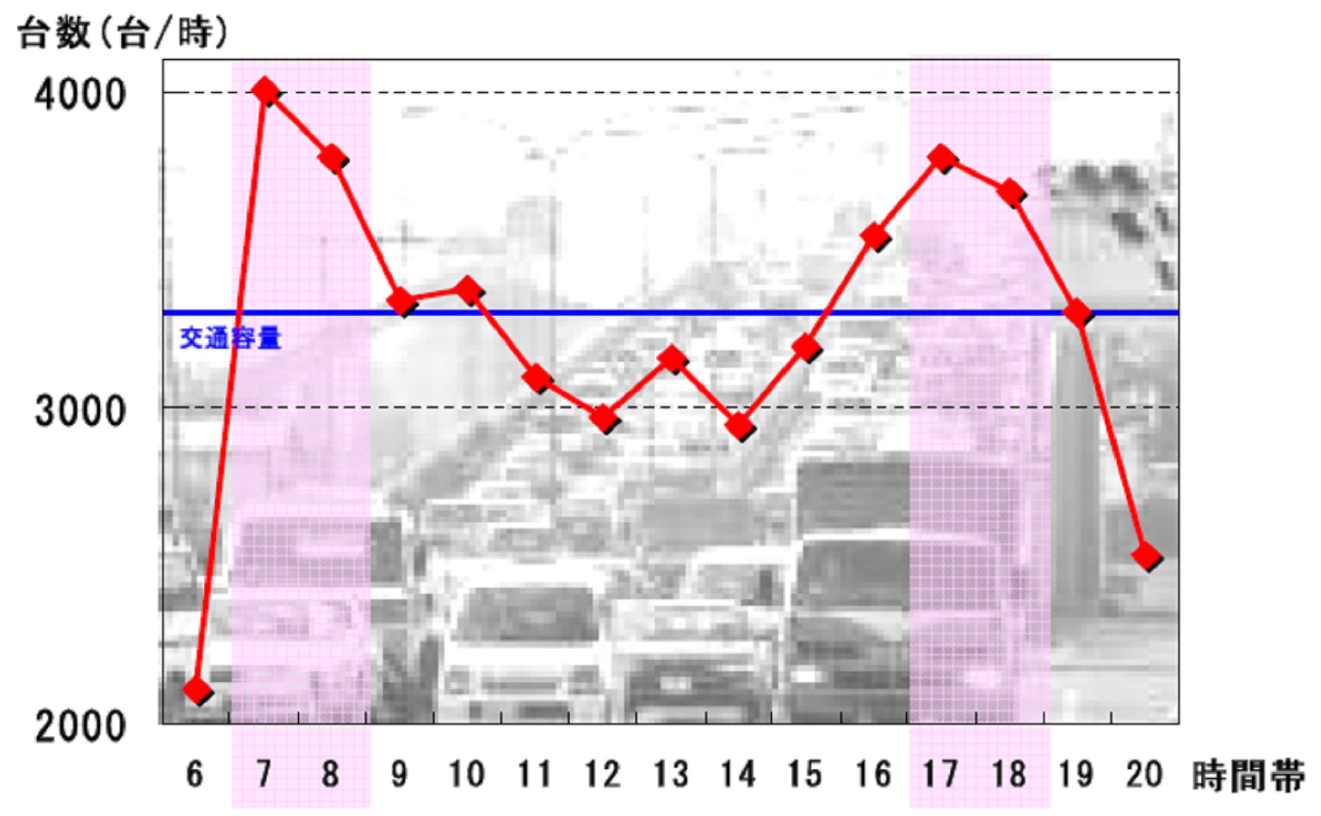 福山都市圏では、クルマ利用者が多く、特に朝夕ピーク時(7時~9時、17時~19時)に交通が集中しており、交通渋滞が発生しています。交通渋滞により多くの排気ガスが排出され、環境悪化(地球温暖化問題)の1つの要因となっています。